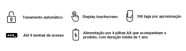 Capacidade máxima de senhas: Até 09 senhas de 4 a 12 dígitos (1 senha de administrador; 4 senhas de usuário; 4 senhas de visitante)